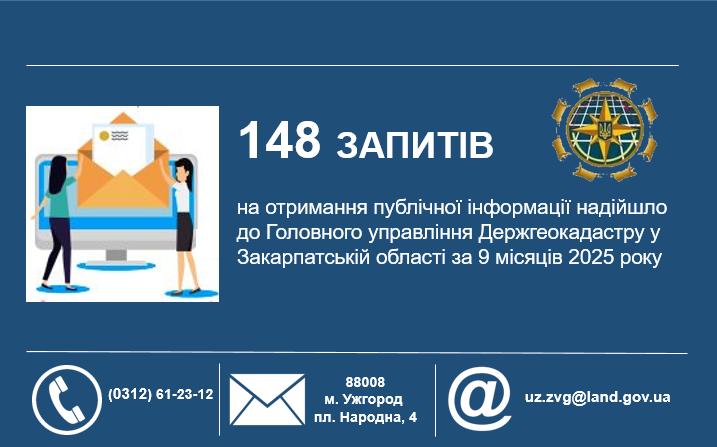 За дев`ять місяців 2025 року Головне управління Держгеокадастру у Закарпатській області отримало 148 запитів на публічну інформацію відповідно до Закону України «Про доступ до публічної інформації». З них: 104 безпосередньо від громадян, 22 – від центрального апарату, 13 – від юридичних осіб, ще 9 запитів надійшли від засобів масової інформації.